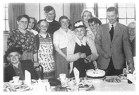 The Derby and Joan Club. Cutting the cake is the oldest member, Mrs