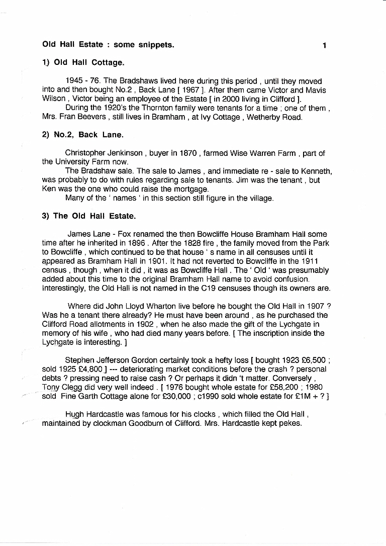 8. & 9. Summary of historical data from Old Hall Cottage Deeds. Refering to Old Hall Cottage; 2, Back Lane and The Old Hall Estate.