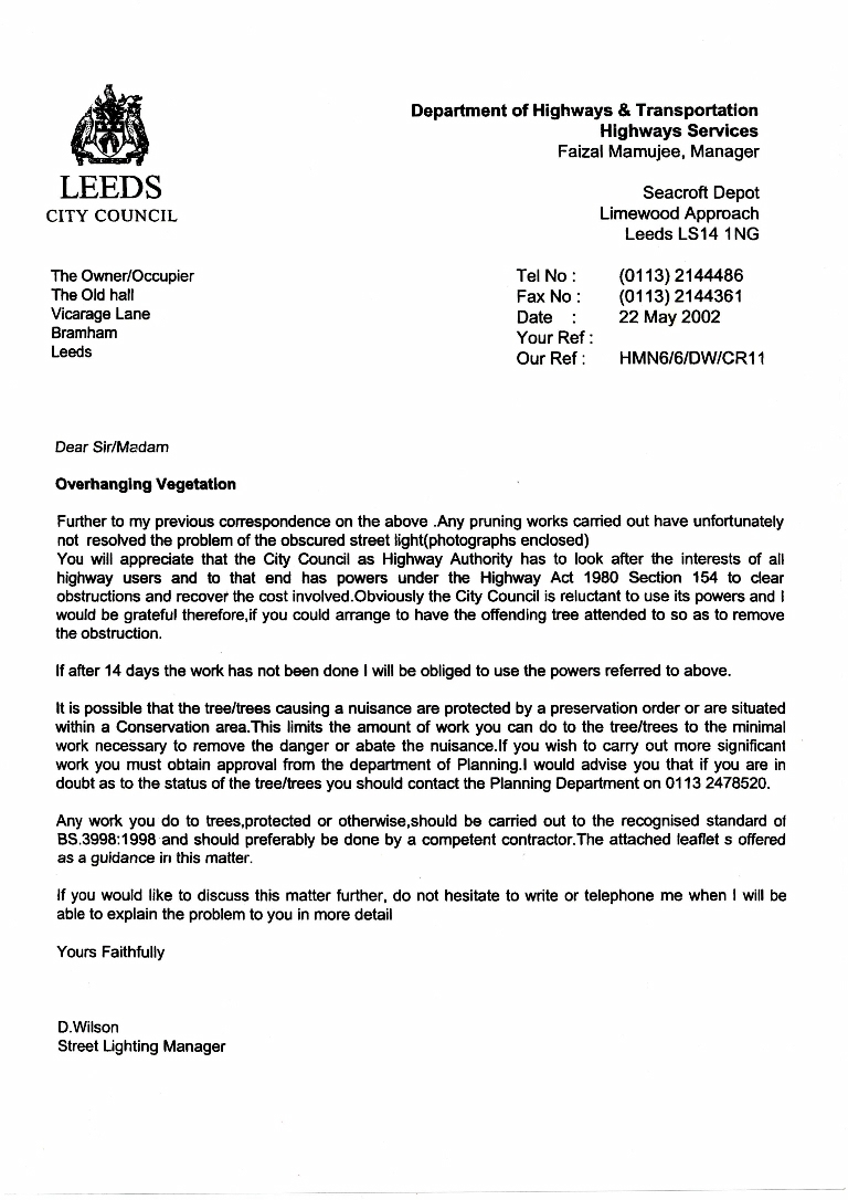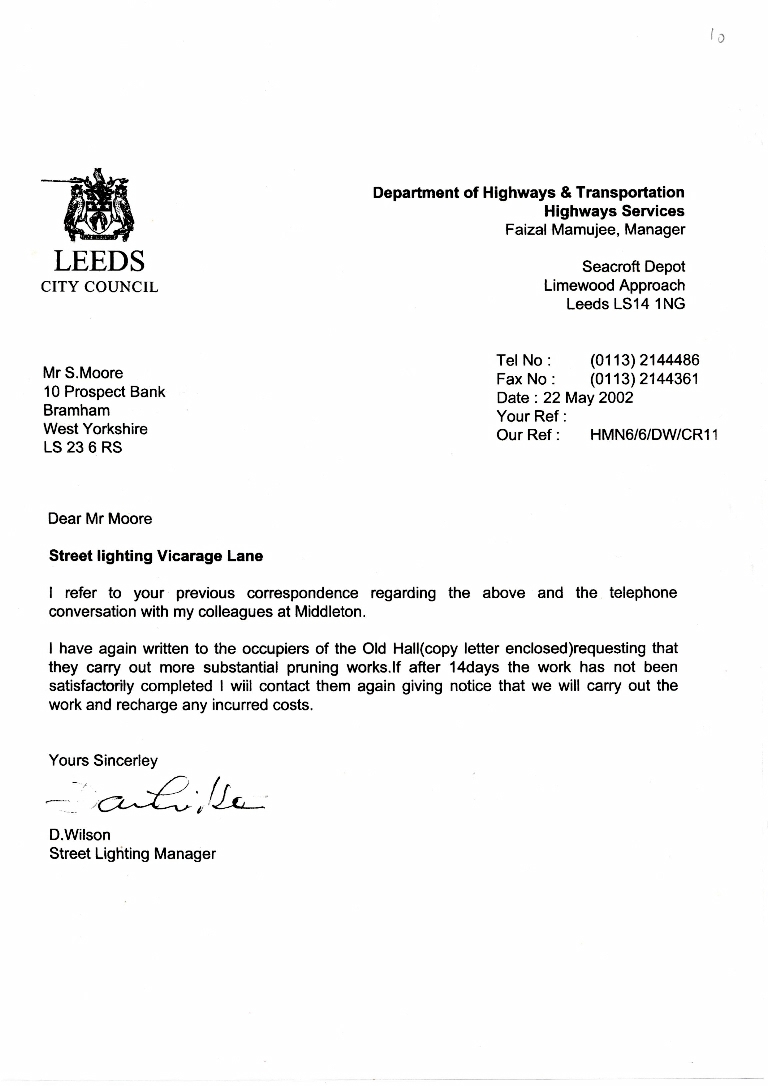 12. Letter from D. Wilson, Street Lighting Manager to S. Moore of 10, Prospect Bank, advising him the owners of Old Hall told to carry out more substantial pruning works dated 22/05/2002.