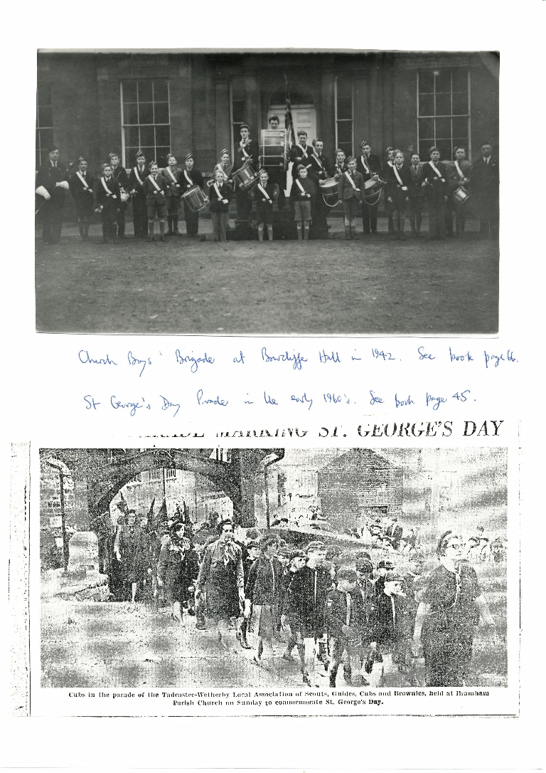 9. Photos of the Church Boys' Brigade at Bowcliffe Hall in 1942 and of the Scouts, Guides, Cubs and Brownies parading to the church in the early 1960s to commemorate St. George's Day.