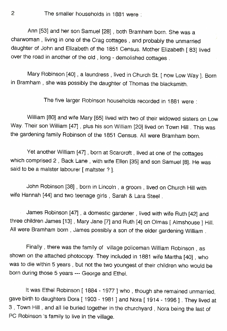 2. The census of 1881 notes several Robinson families scattered around Bramham, working at various trades. Of note is the fact that the village policeman is William Robinson.