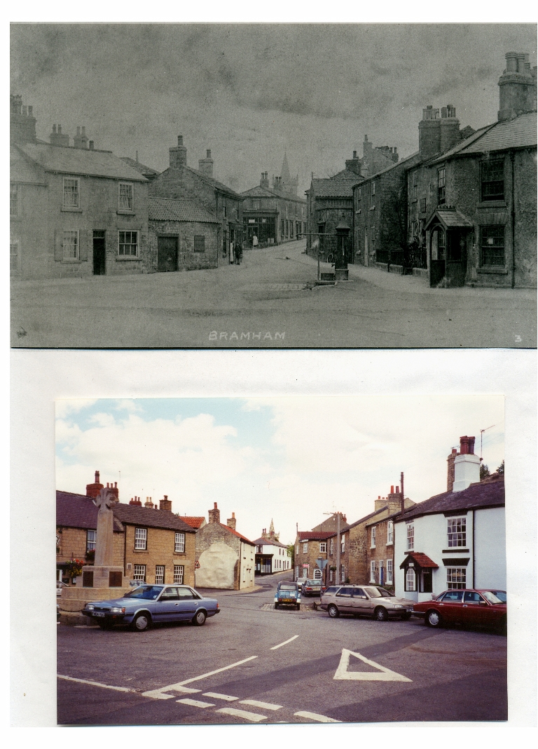 1. A colour photo dated approx. 2000 and a black and white photo, probably about a century earlier, taken from the edge of Bowcliffe Road a few metres from the front of the Bay Horse looking towards the bottom of The Square