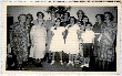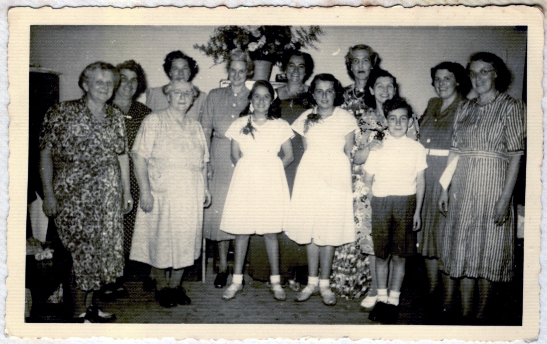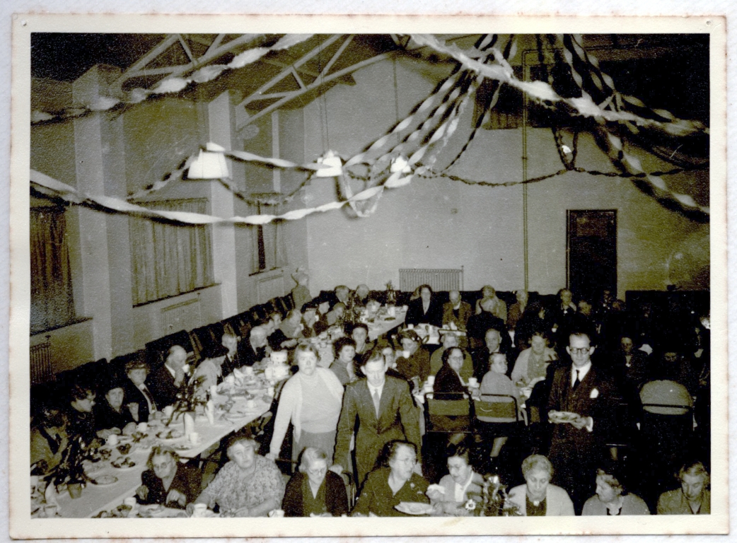 2. Large group, mostly ladies, dining in a festively decorated hall, undated.