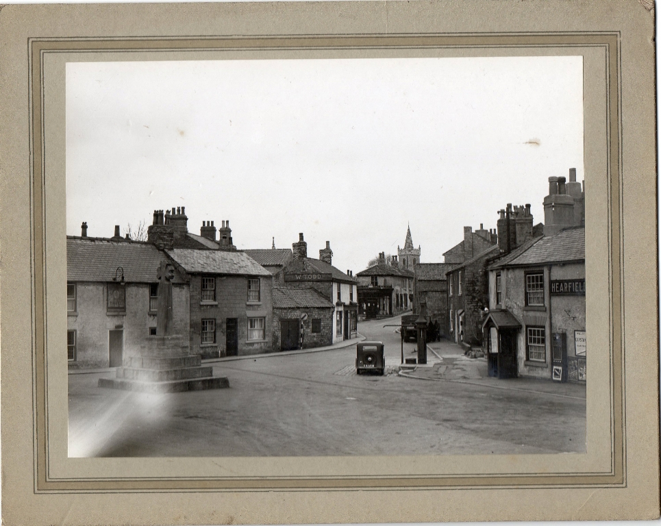 5. 1920's photograph of Bramham Village Square showing the war memorial. Harriet Fisher's shop is on the left (double fronted) - husband Fred's van is parked in front of the shop.