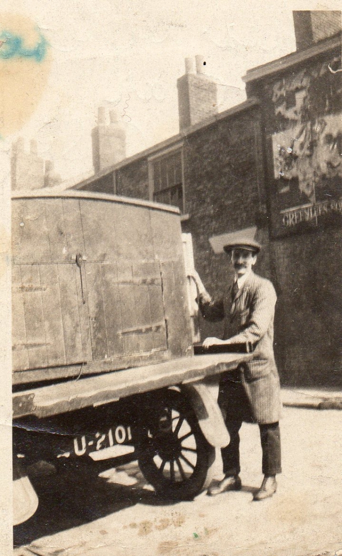 8. Grandfather Frederick C. H. Fisher by his van in front of the shop in Bramham circa 1925. It was a butchers shop in those days, now part of the Red Lion pub.