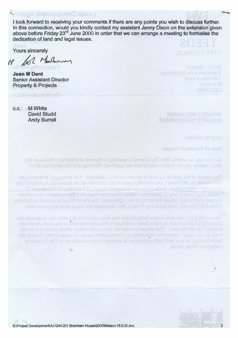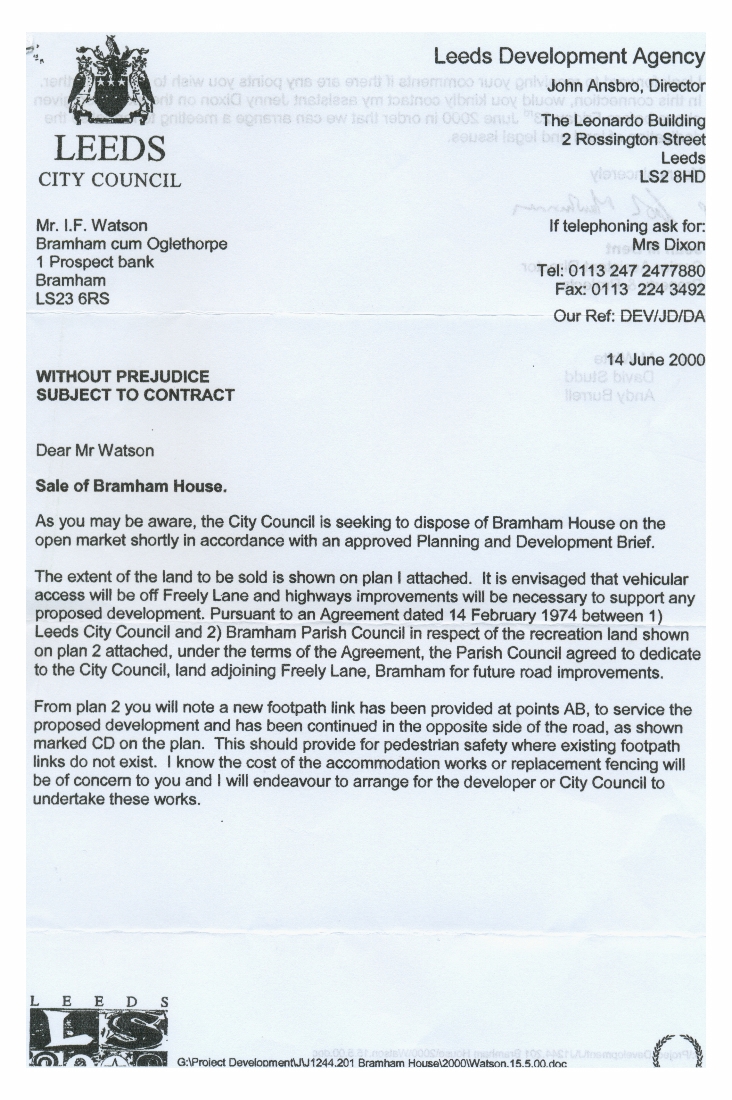 4. & 5. A letter dated June 2000 from Leeds City Council notifying their intention to dispose of Bramham House and indicating that development of the grounds will require changes to Freely Lane affecting the Playing Field.