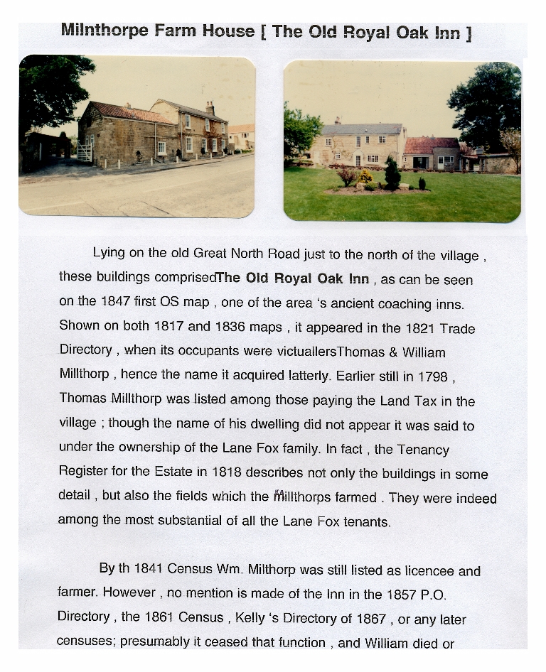 5. & 6. A two page history of Milnthorpe Farmhouse, originally The Old Oak Inn, a coaching inn, in the early 19th or possibly late 18th century. Three photographs, probably late 20th century, are included.