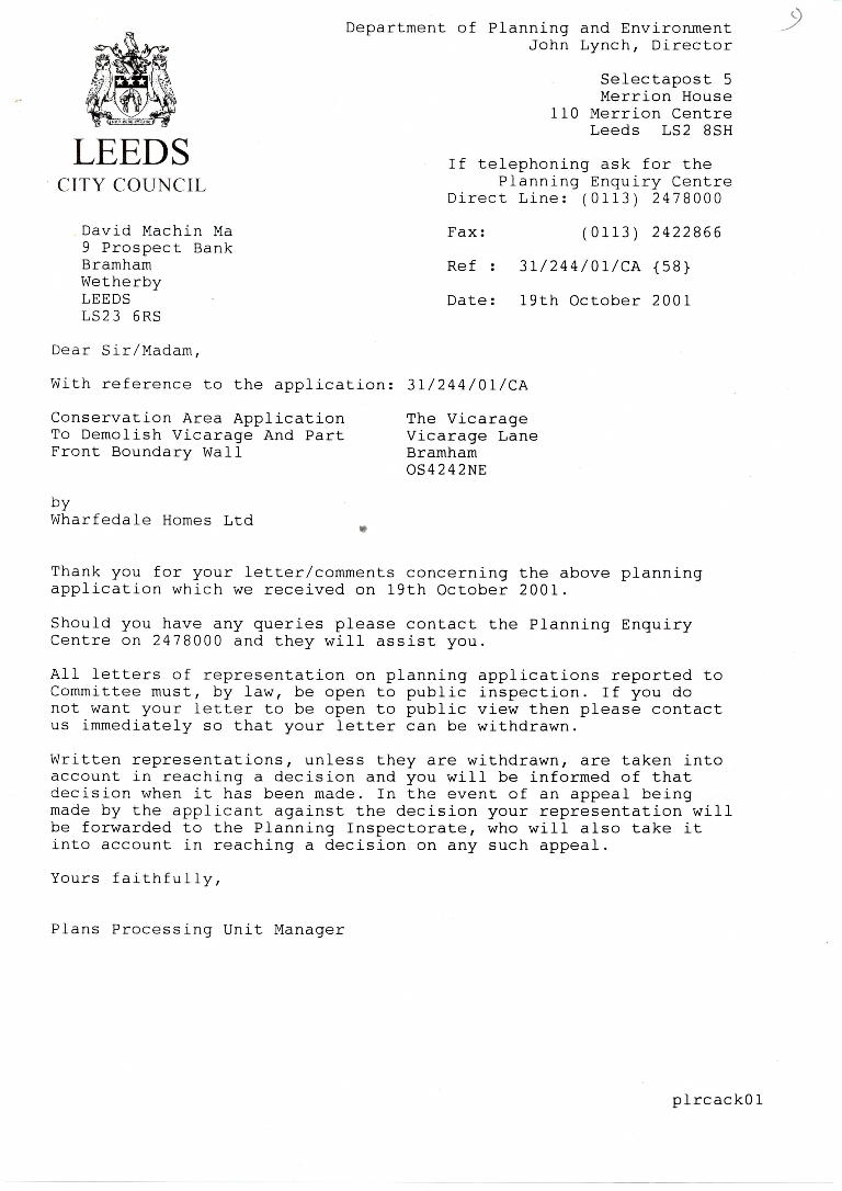 20. - 29. Correspondence in 2001 concerning the proposal to demolish the New vicarage and replace it by a terrace of four 3-storey flats.