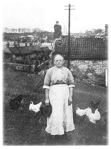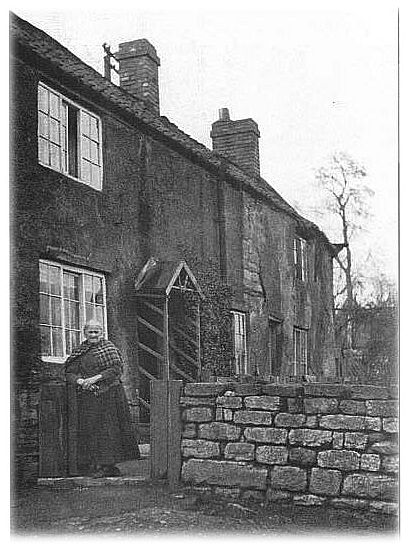 This is the front view of the cottages shown from the back in the other photograph. Only the one outside which Mrs. Brooksbank is standing now remains. |