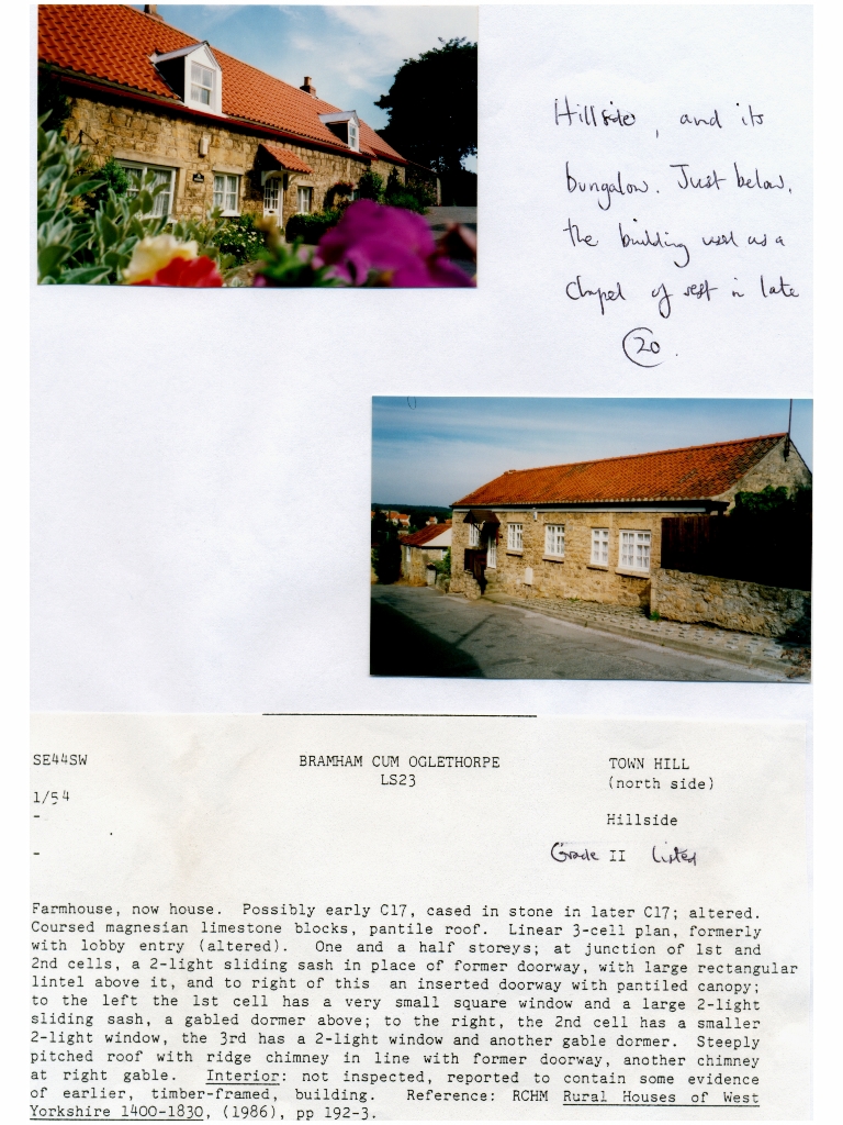9. Two colour photos c.2000 of Hillside one of which also includes the building just below it that was used as a Chapel of Rest by Geoff. Wood in the late 20th century. In addition there is a 1986 write up describing Hillside as a farmhouse and a Grade II listed building, possibly dating from the 17th century, with details of its construction.