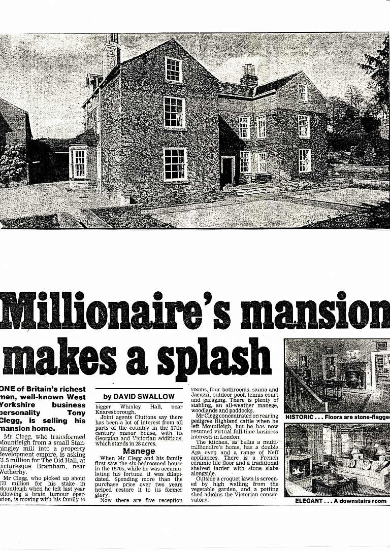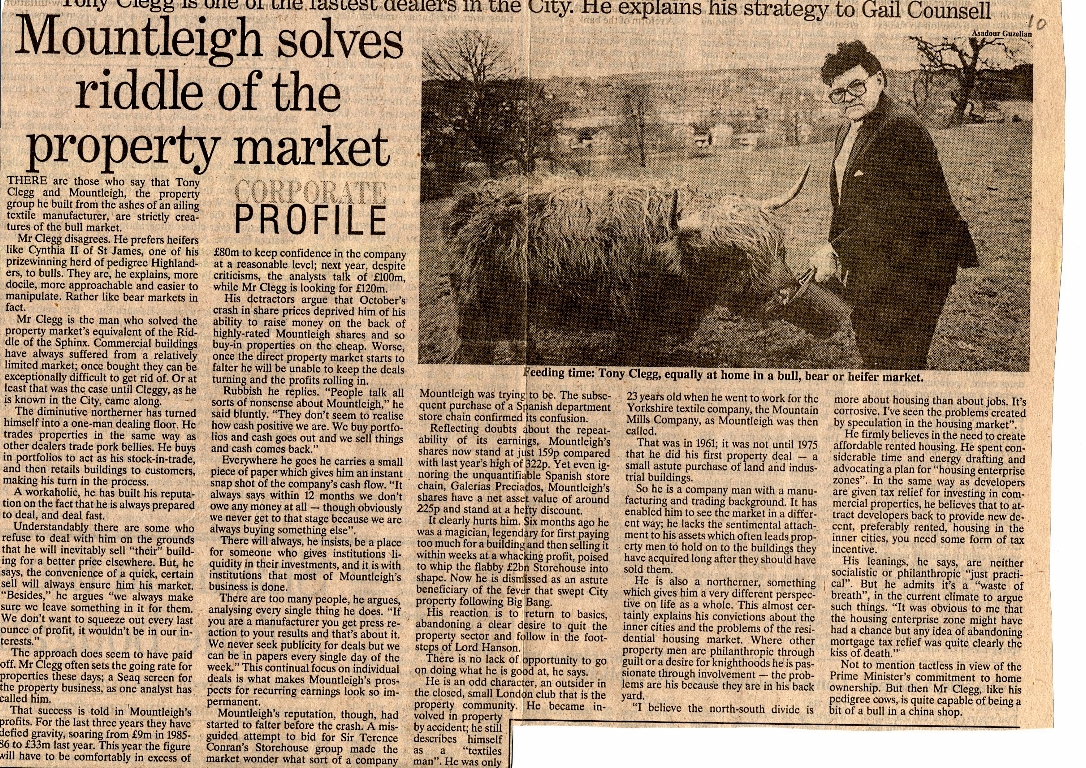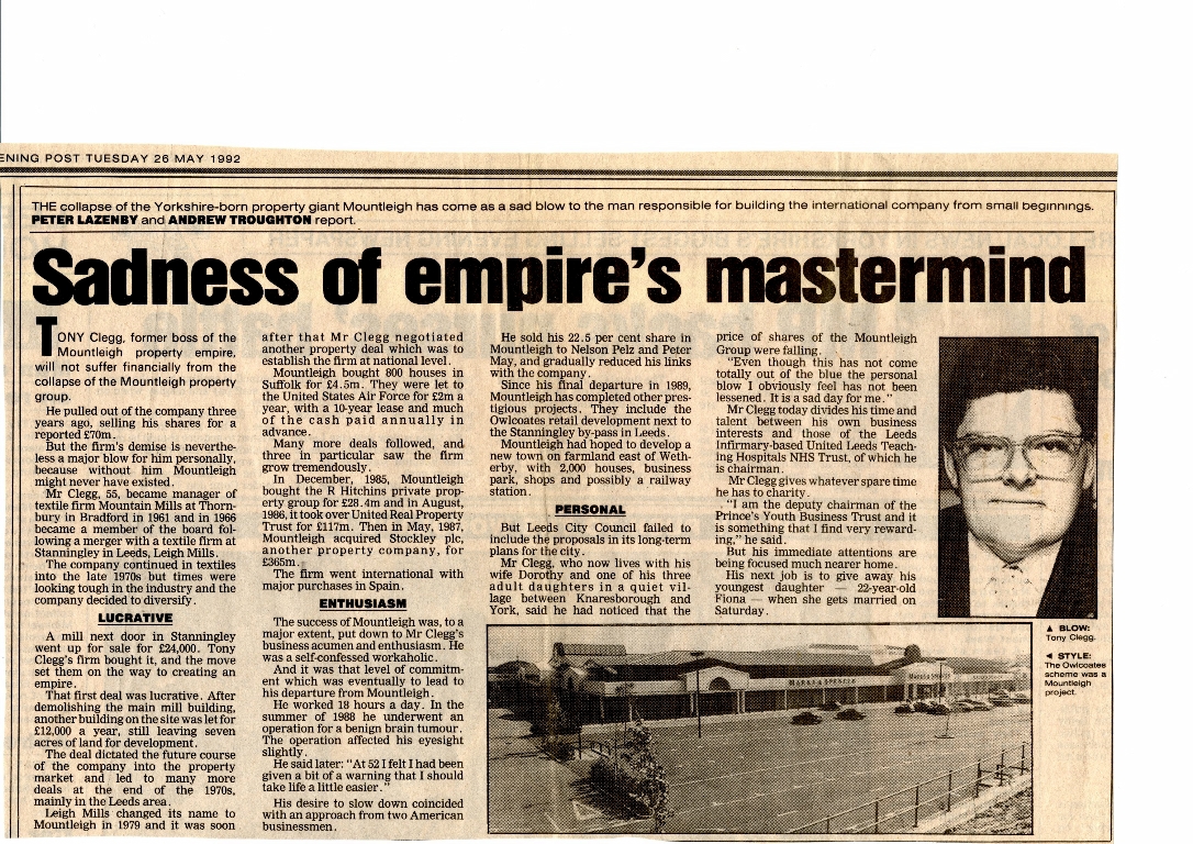 6. Newspaper article 26/05/1992 re the collapse of Mountleigh. Clegg had previously sold his share for £70m and was therefore unaffected. He went to live in Whixley Nr York but died 1 June 1995.