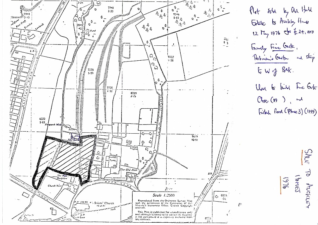 18. Plan showing land sold by The Old Hall Estate to Auckley Homes for development of Fine Garth Close 12/05/1976 Sale price £24,000.Scale 1/2500. Includes land developed as phase 3 of Firbeck Road in 1999.
