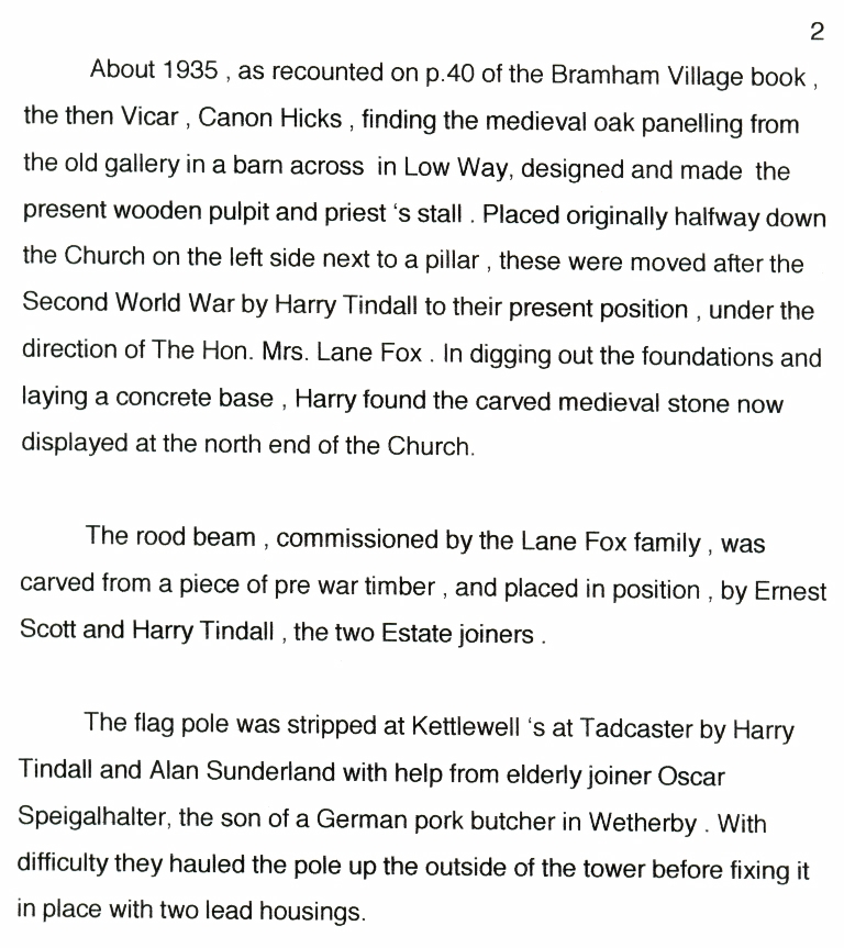 1. & 2. Recollections of Harry Tindall concerning the 1853 alterations, the 1902 Lychgate, the 1935 Pulpit, the Rood Beam and the Flagpole