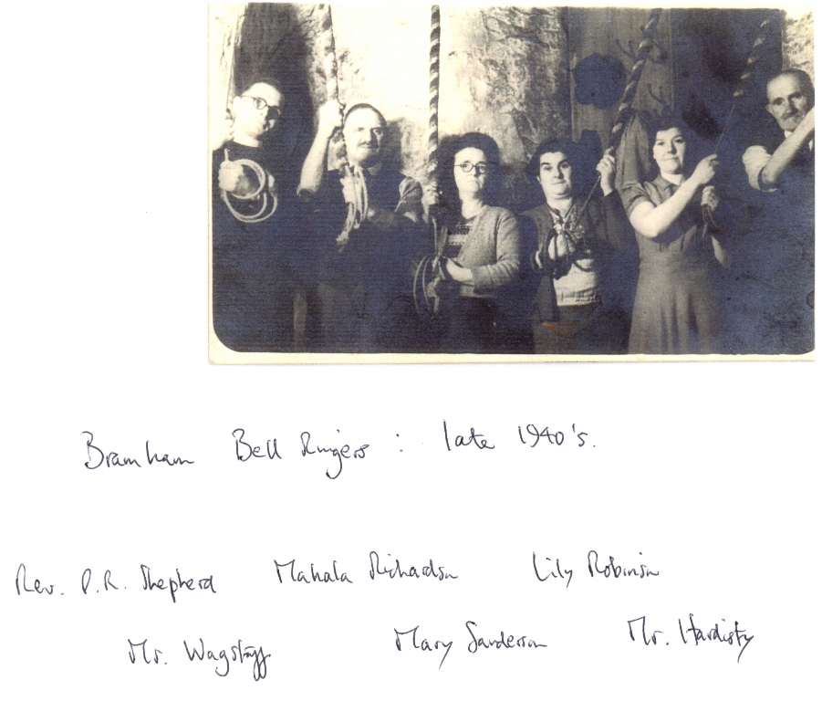 2. Photograph of the ringers in the late 1940's - Rev P R Sheperd, Mahala Richardson, Lily Robinson, Mr Wagstaff, Mary Sanderson & Mr Hardisty