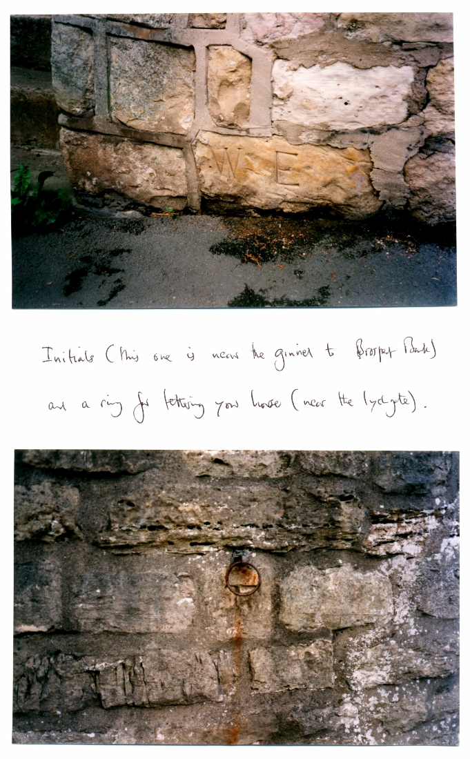 3. 2 churchyardpuzzles, one of initials carved into the base of the stone wall of the Prospect Bank ginnel, the other of a ring for tethering horses by the lychgate.