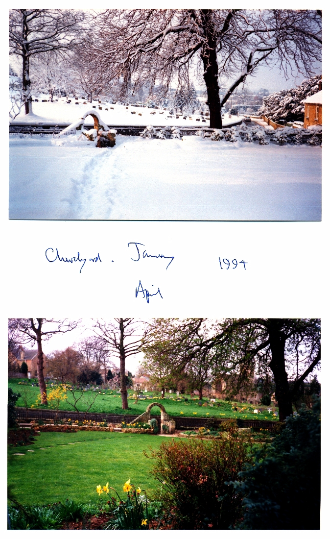 1. Photo of the Churchyard from the garden of 9, Prospect Bank taken in the snow Jan 1994, another in April 1994.