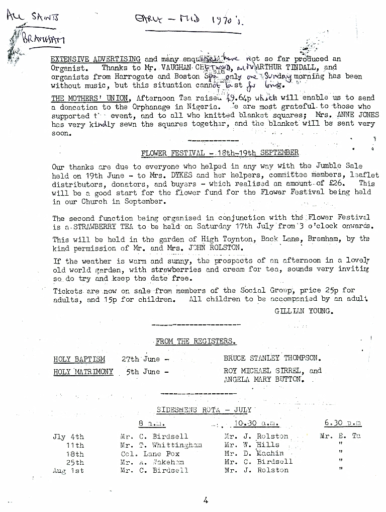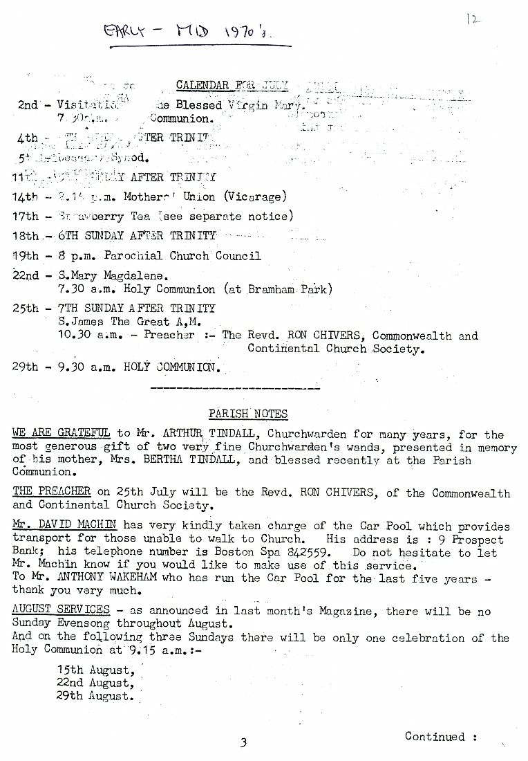 1. & 2. Details of a Church Calendar for the month of July in the mid 1970's