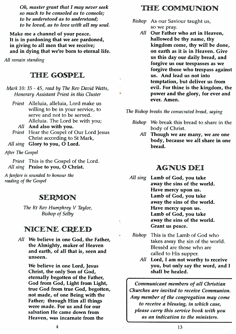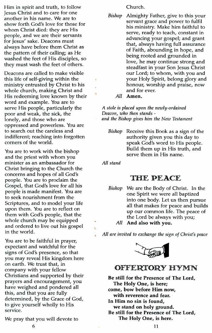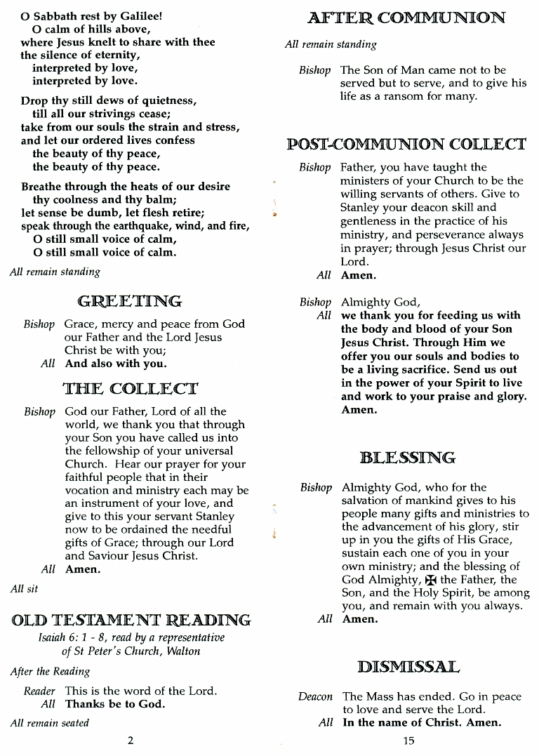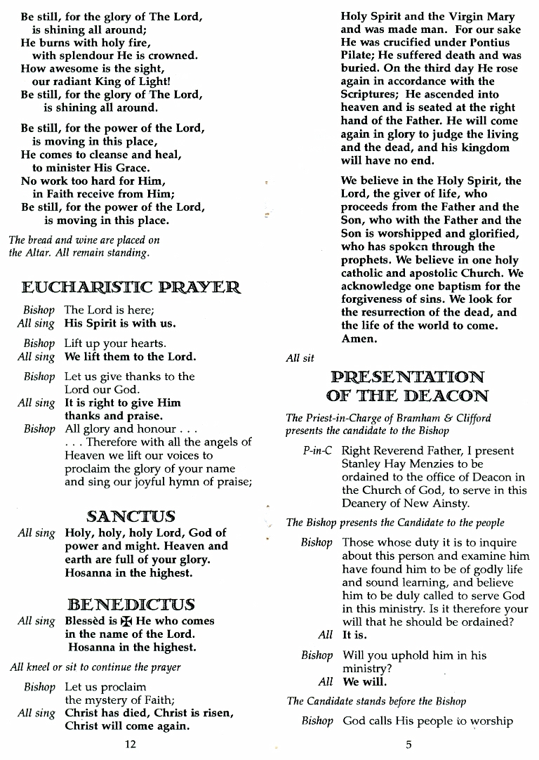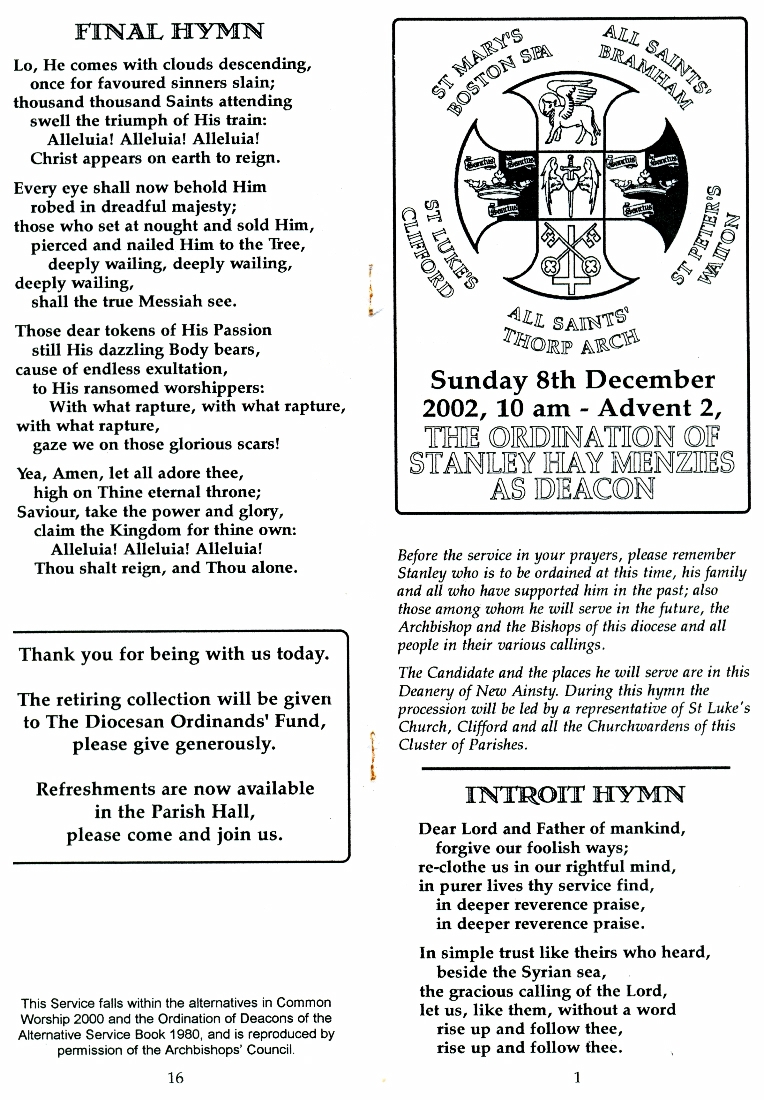 1. - 8. The order of service for the ordination of Stanley Hay Menzies as Deacon 8th December 2002