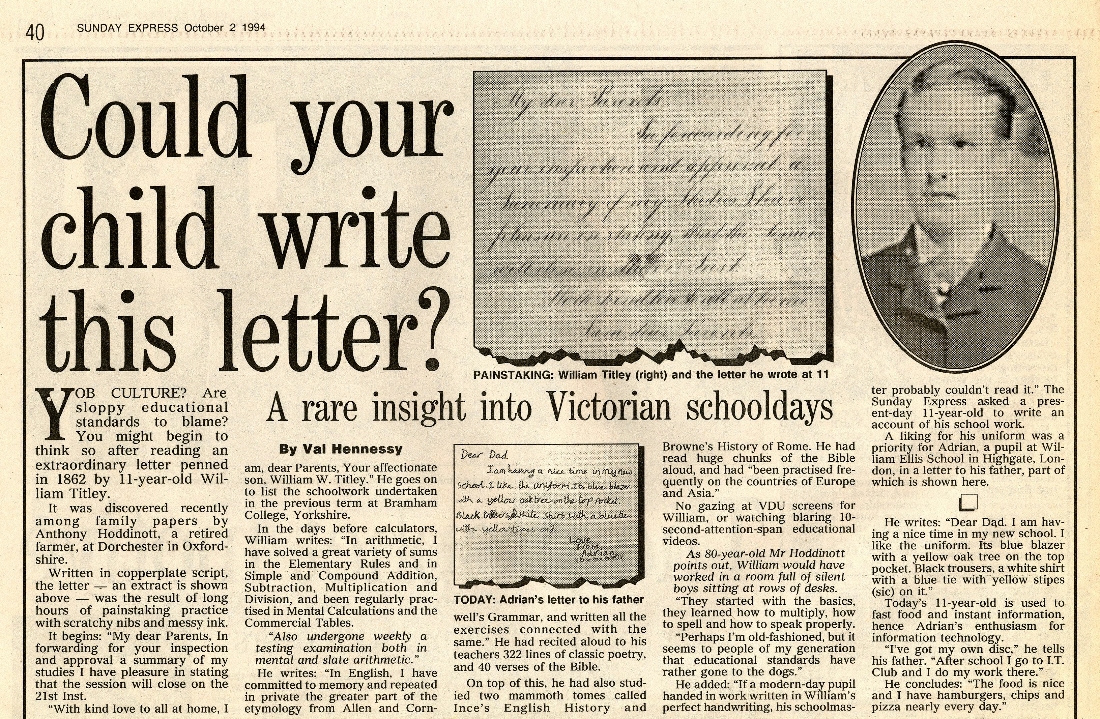 1. Article Sunday Express October 2nd 1994 about a letter written to his parents by a pupil at the College, William Titley, aged 11, in 1862. Details are given about the letter in perfect handwriting together with an account of the boy's educational accomplishments during a term at the school.