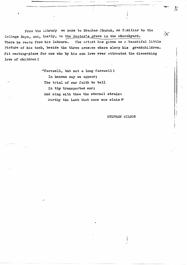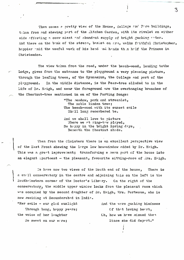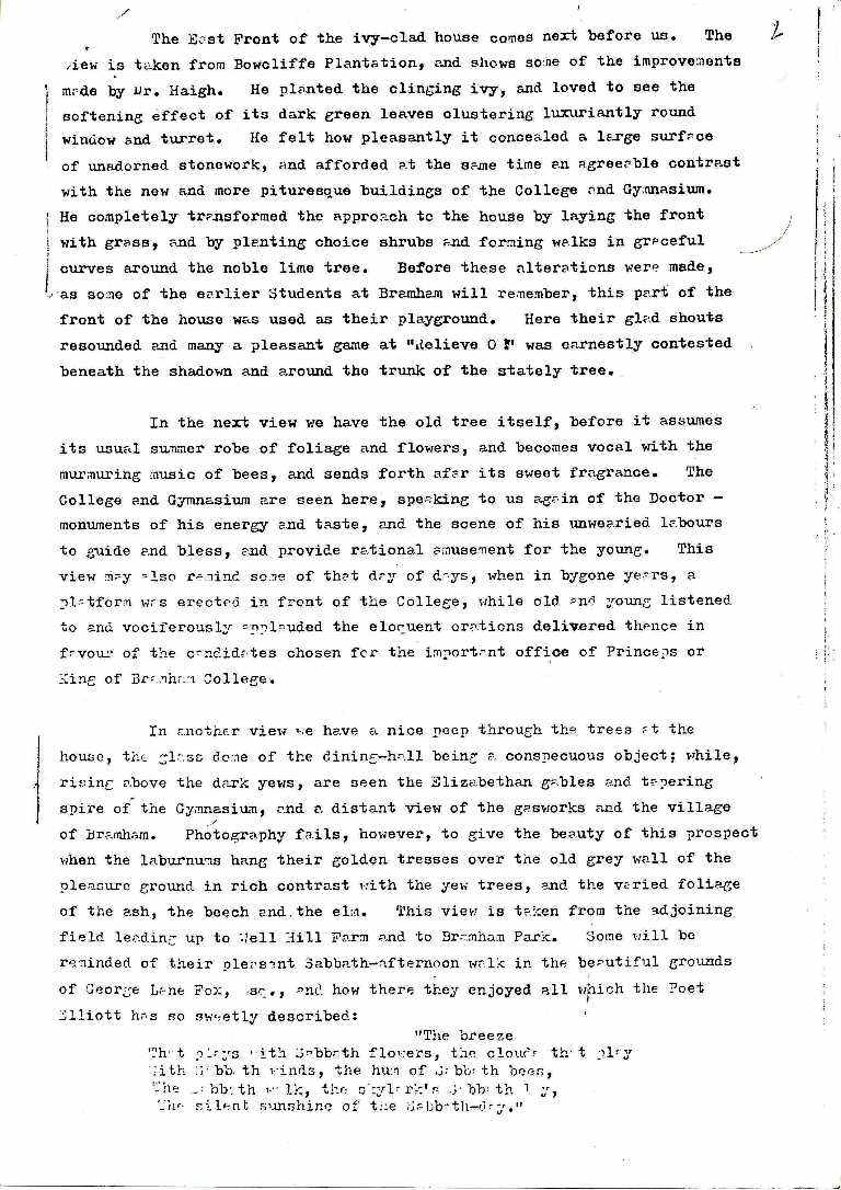 1. - 5. What appears to be an obituary to Dr Haigh, the founder of the College by Stephen Wilson in 1871. It gives details of improvements undertaken together with a description of it's environment. There are reciting's of poetry and the 'Bramhamite' football song.