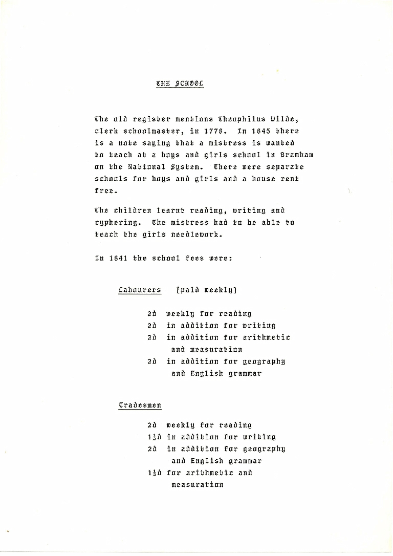 1. Reference to an old register, mention of Theophilus Wilde, schoolmaster 1778. Advert for schoolmistress 1845, Scale of fees in 1841.