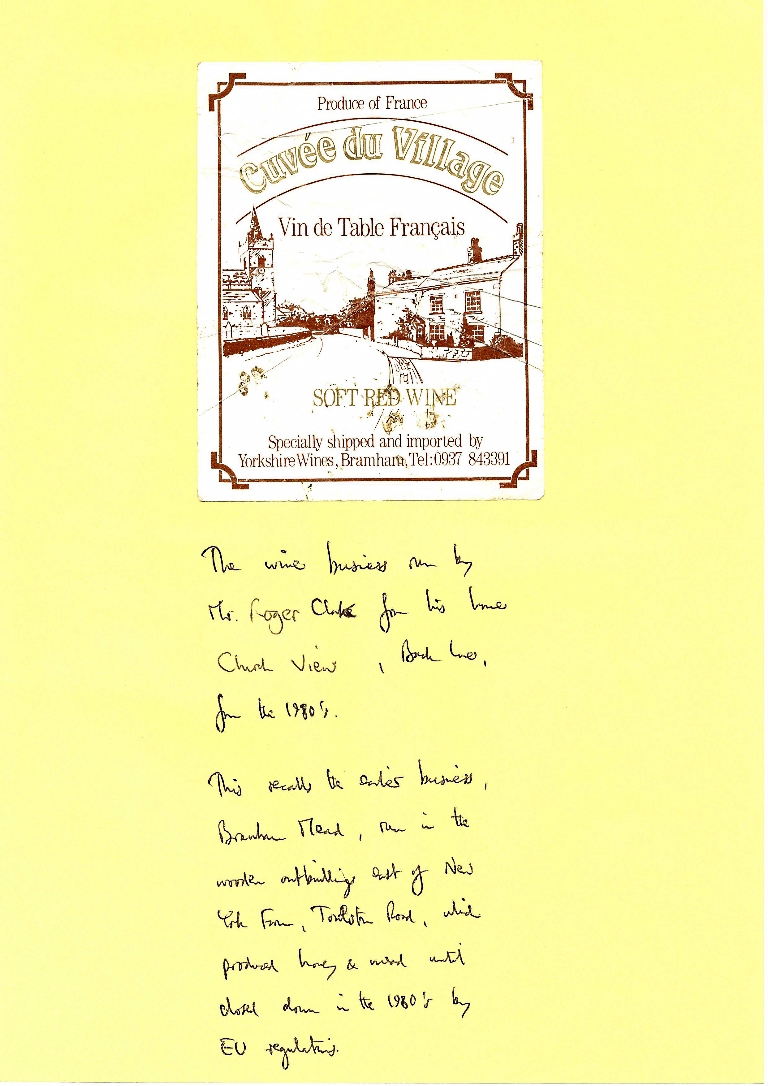 1. The label of Yorkshire Wines, the wine business run by Roger Clarke, Church View, Back Lane, from the 1980s.