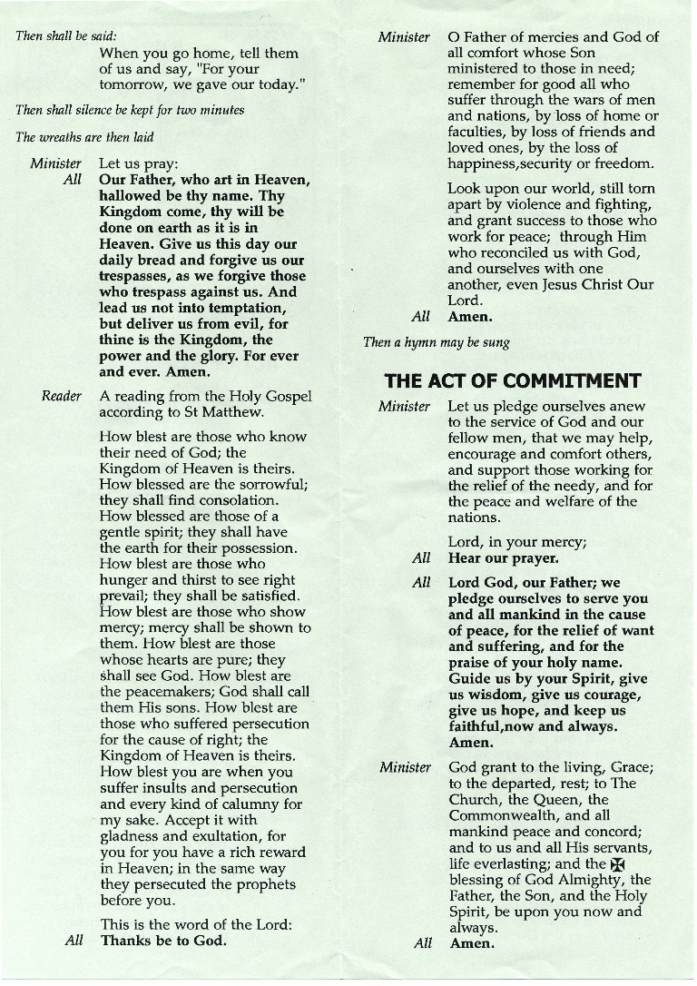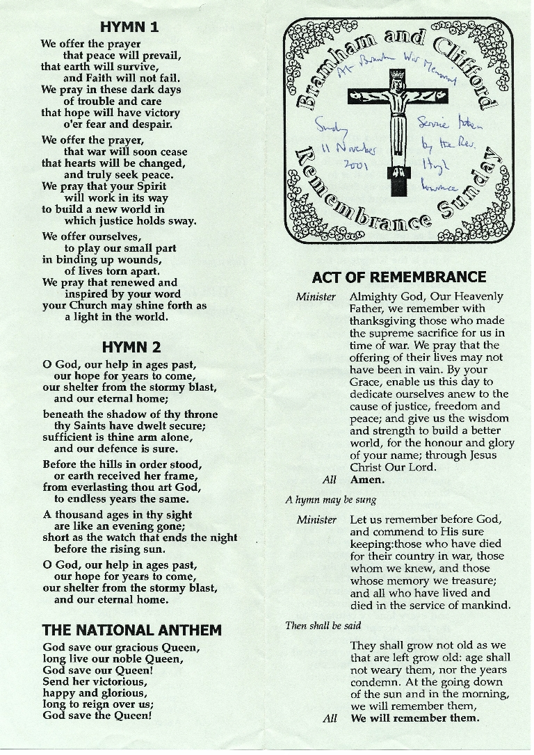 1. & 2. A leaflet of the hymns and prayers used at the memorial service held at the village war memorial 0n 11th November 2001.