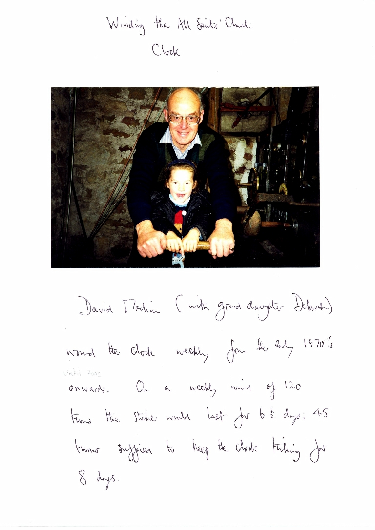 2. Photo of David Machin (assisted by granddaughter Deborah) winding the church clock, plus a note on the statistics of winding.