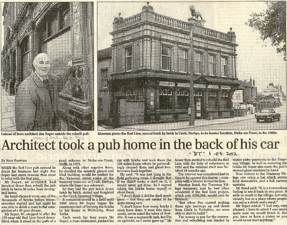1. An illustrated Daily Telegraph report of August 2002 about architect Mr. Soper's initiative in moving a demolished Victorian public house from its original site in Stoke-on-Trent to its new home at Crich Tramway Museum.