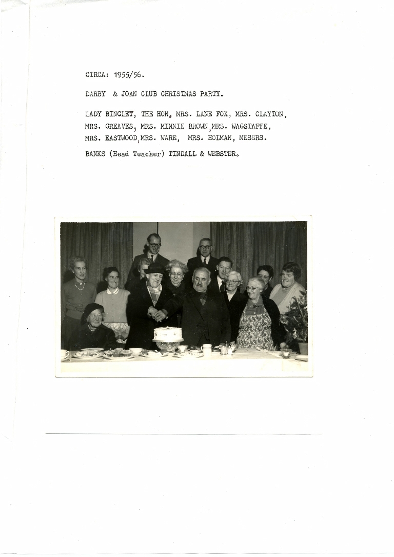 6. A Darby & Joan Club Christmas Party in the 1950s with Mrs. Dickinson cutting the cake and the Hon. Mrs Lane Fox in attendance (at the back between Rev. Shepherd and headmaster Mr. Banks).