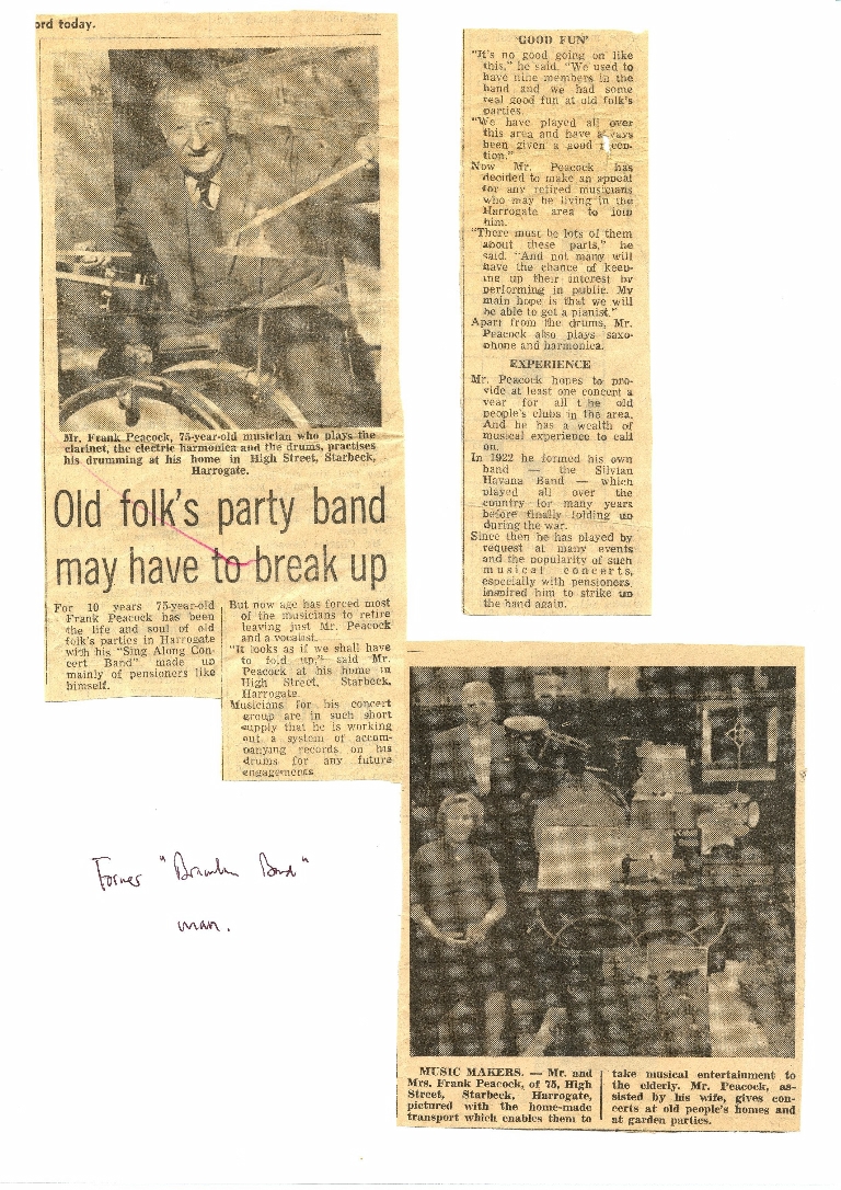 4. Undated newspaper article (probably 1970s) on 75 year old Frank Peacock, formerly a "Bramham Band" man having to give up his "Sing Along Concert Band" for Old Folks in Harrogate because age was forcing supporting musicians to retire.