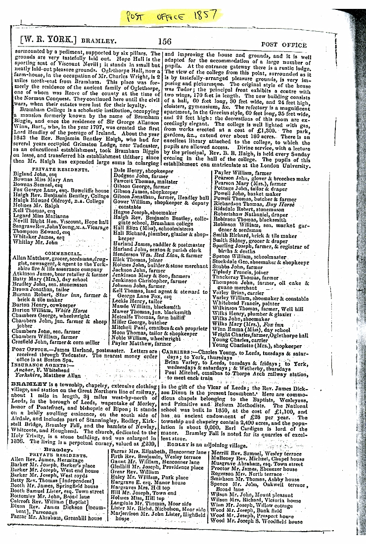 1. Page 156 of the 1857 Post Office Directory with information on Bramham.