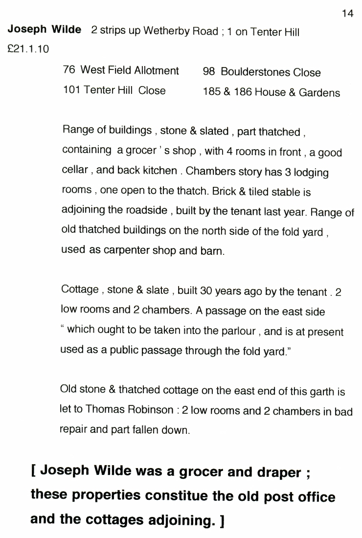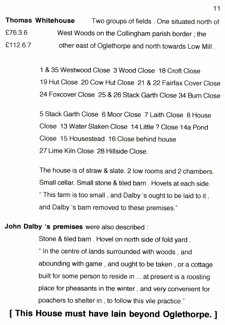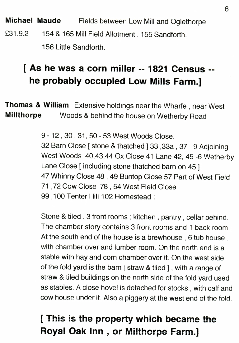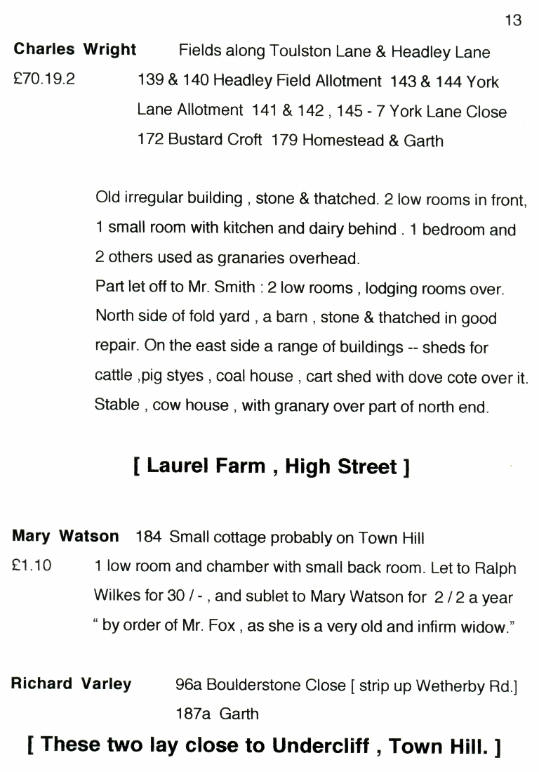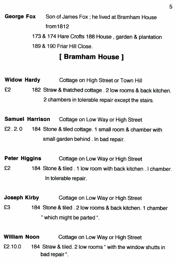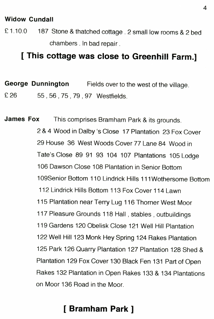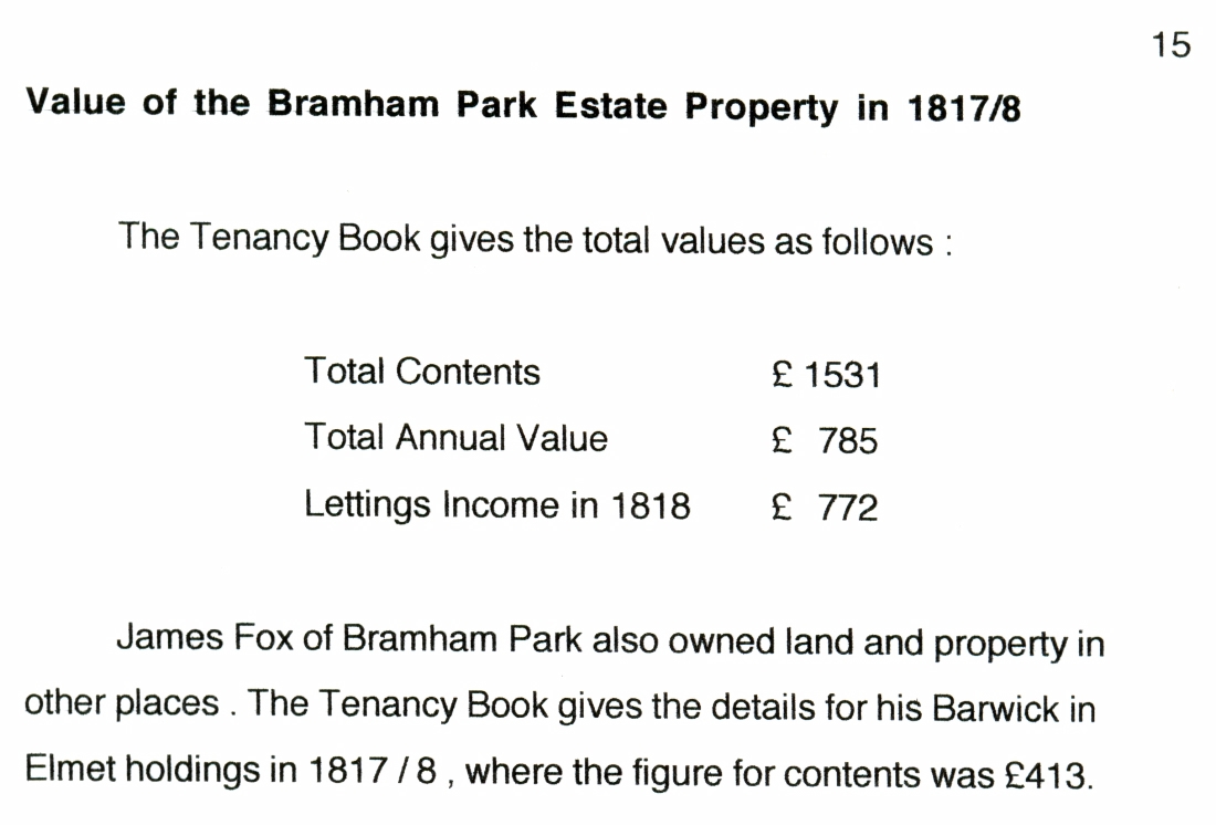3. - 15. Names of Bramham Park Estate tenants in alphabetical order with information on the amount of land held, value of tenancy, key reference numbers of the plots of land as shown on the 1817 map of the parish, details of the buildings, business of the tenant and name of the house or farm if known. The final page gives values for total contents, total annual value, and lettings income in 1818. Reference is also made to other James Fox property elsewhere. |