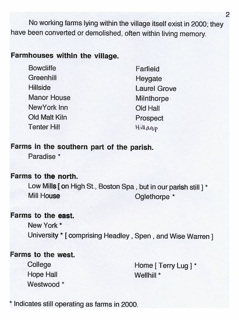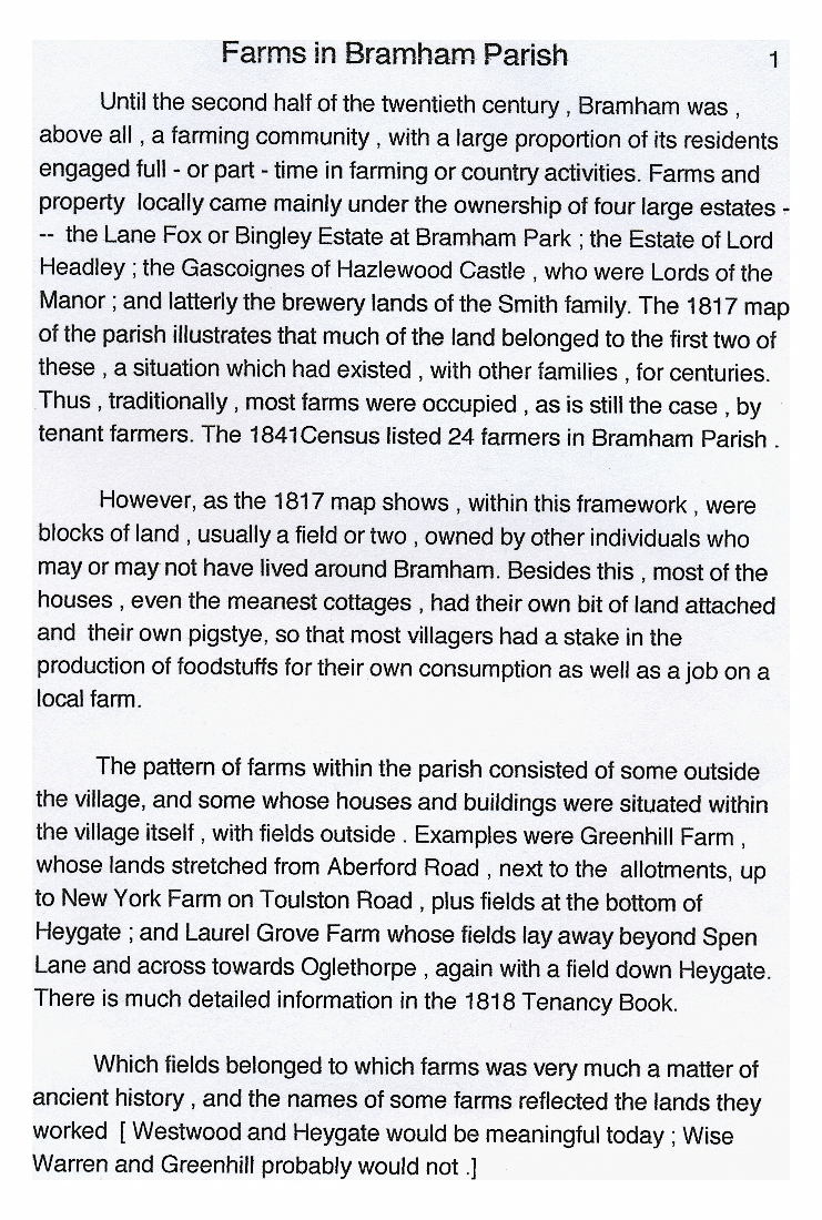 1. & 2. Brief information on land ownership with a list of farmhouses in the village and of farm land locations, with asterisks marking the farms that were still in operation in 2000 Historically most farmers were tenant farmers. The 1841 census showed 24 farmers in Bramham parish.