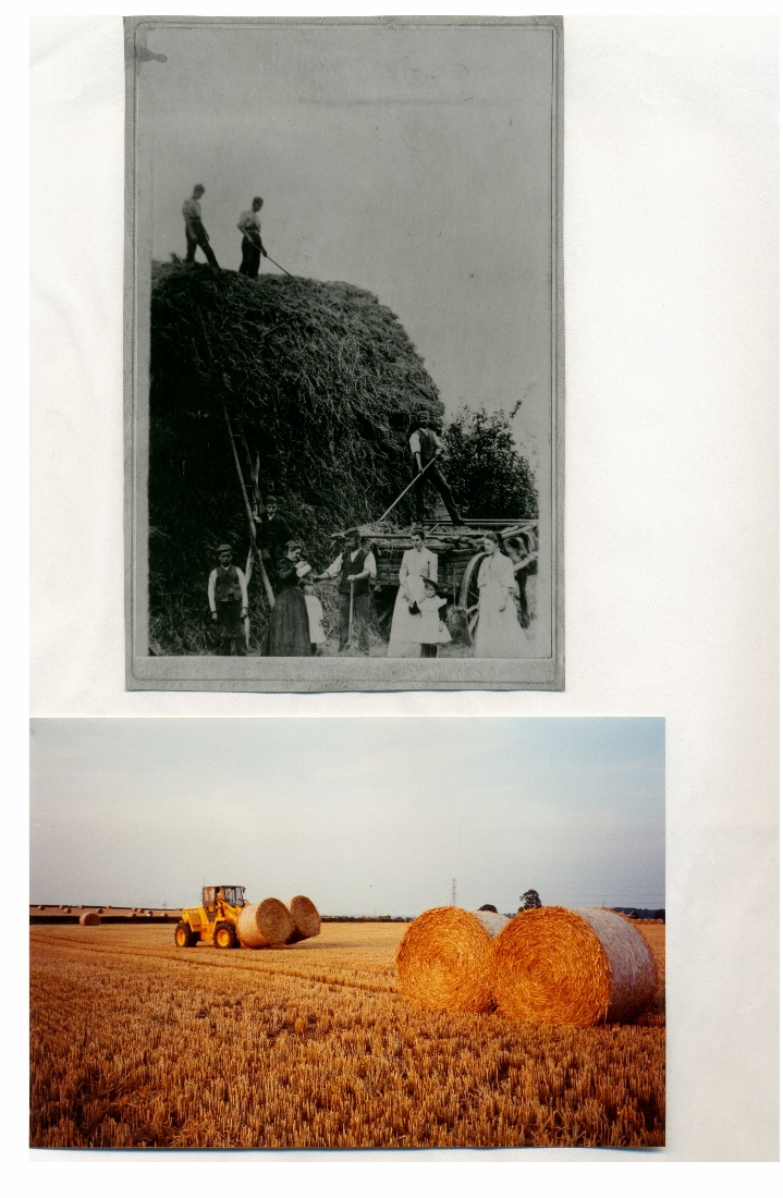 3. Untitled - Two photographs - Firstly a black and white photo of a threshing machine (which appears to be a fairly early one despite having rubber tyred wheels). It was owned by by Mr. Lawn of the Farm at Bramham Cross Roads and in the 1930s and 40s he used to hire it out. Secondly a colour photo of a combine harvester apparently harvesting a field of wheat alongside Heygate Lane.