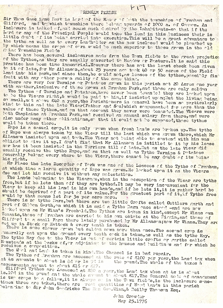 1. A description dated May 25.1776 by John Crowder giving details of the Lord of the Manor, early enclosures, crops, and the tithes that had to be paid to the vicar.