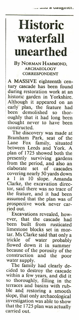 13. An undated press report by Norman Hammond, archaeology correspondent, on the discovery of the cascade.