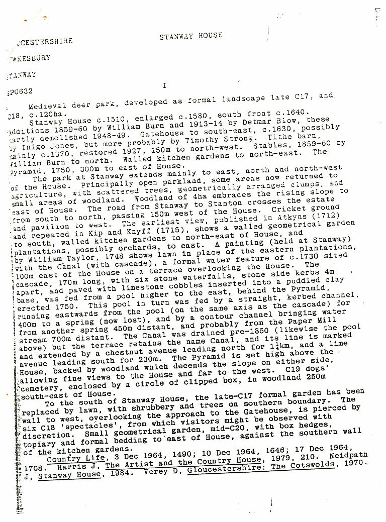14. & 15. A detailed architectural description of the 250 hectare grounds and features of Bramham Park Gardens plus a similar description of Stanway House medieval deer park. These are probably the documents referred to in item 4.