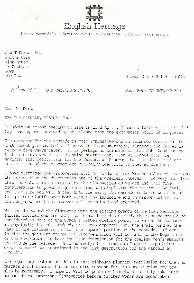4. A letter dated 15 May 1991 from English Heritage to Smiths Gore (the Park's estate agents) discussing the importance of the similarity between the cascade and that of the recently excavated one at Stanway in Gloucestershire (see items 14,15)