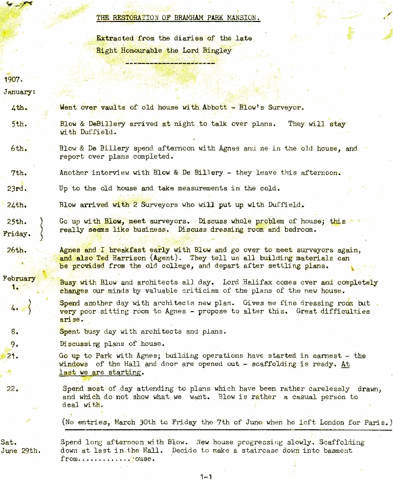 5. & 6. Extracts from the 1907 diary of Lord Bingley recording the preparations for the family's return to living in Bramham Park and the actual return on 7th September for the first time since 1828.