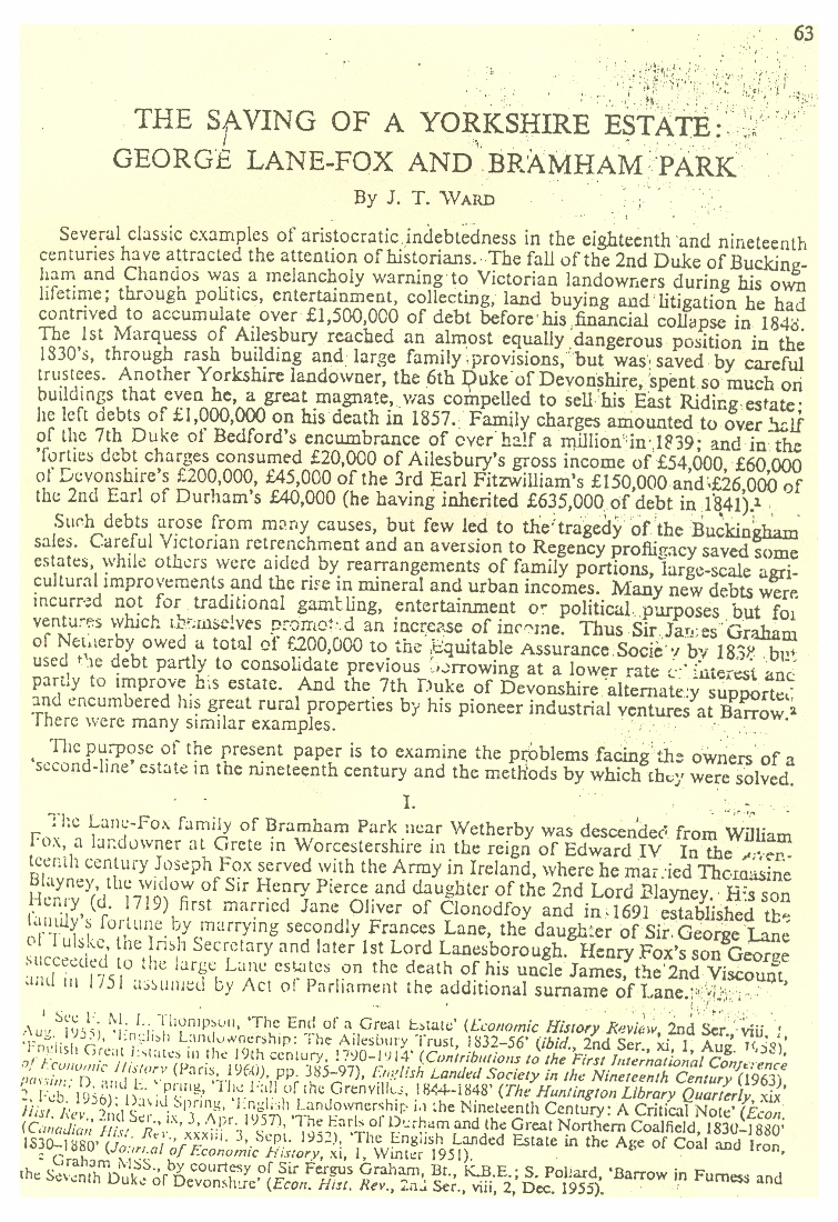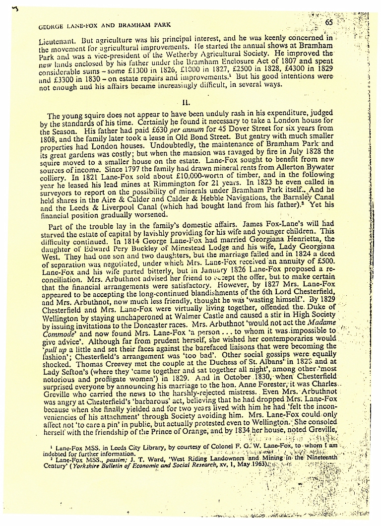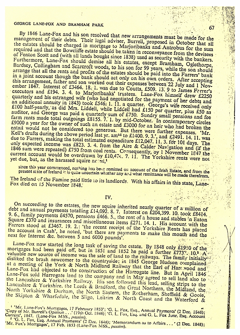 8. - 11. An article entitled "The saving of a Yorkshire Estate: George Lane Fox and Bramham Park" by J.T. Ward relates the financial struggles and domestic complications in the family after the death of James Fox-Lane in 1821 and despite taking reasonable steps to resolve the situation his successor died in 1848 leaving debts in excess of quarter of a million pounds. His successor in turn tackled the problem by selling off various strips of land around the country to various railway companies.