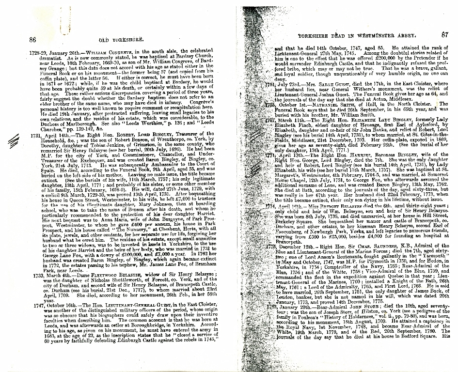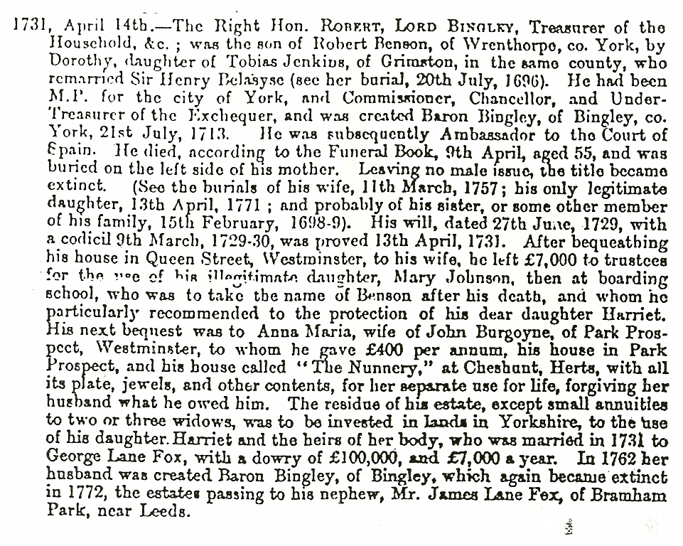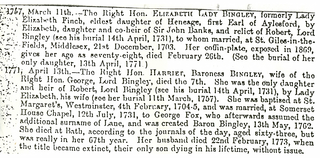 1. Page 86 of "Yorkshire Dead in Westminster Abbey" recording the interment on 14 April 1731 of The Right Hon. Robert Lord Bingley who died on 9th April 1731 aged 55.