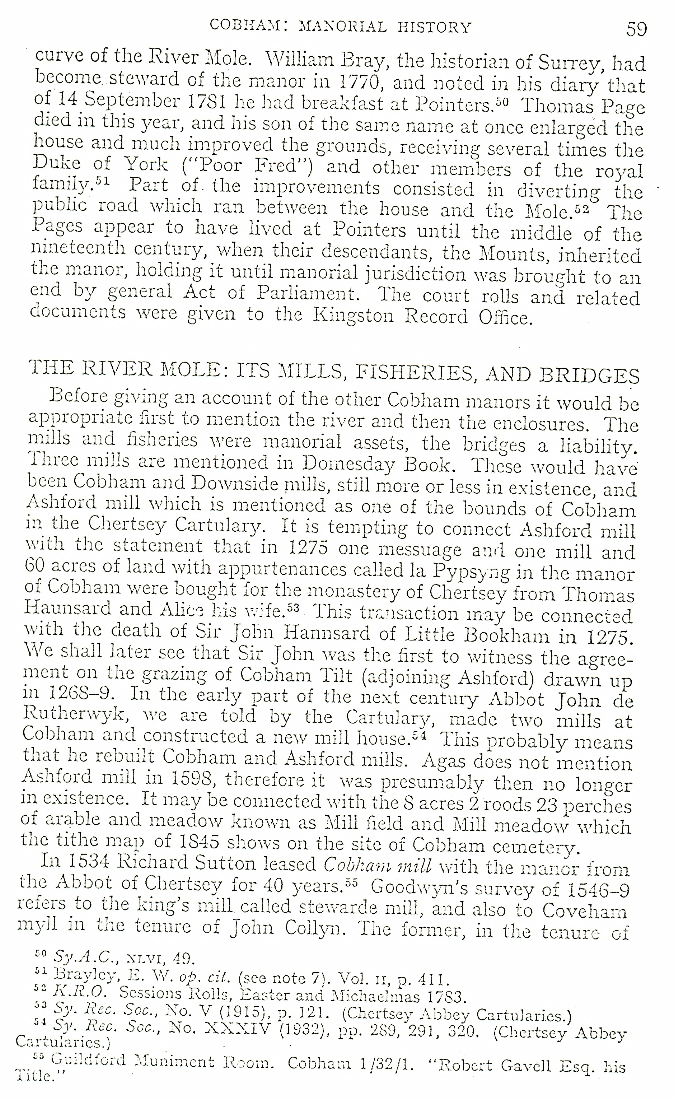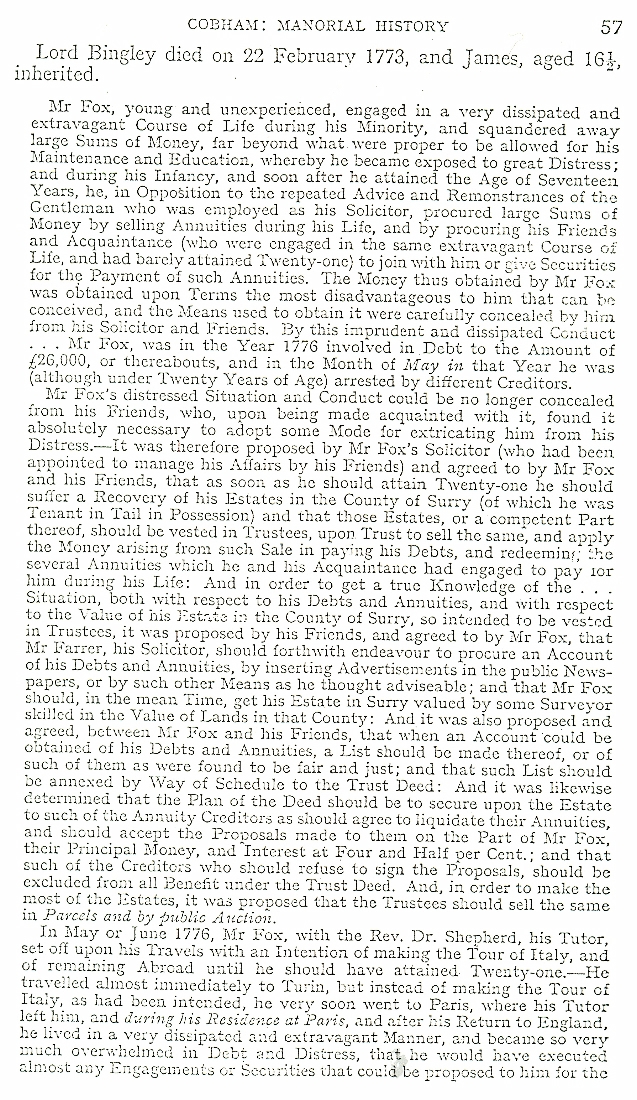 4. Notes relating to the Manor of Cobham owned by the Lane Fox family, recording also that George Lane Fox was created Lord Bingley in 1762 and interested himself in laying out the grounds at Bramham though continuing to live in East Horsley.