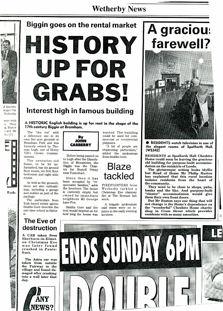 6. A partial and undated Wetherby news article reporting that Bramham Biggin is available for renting