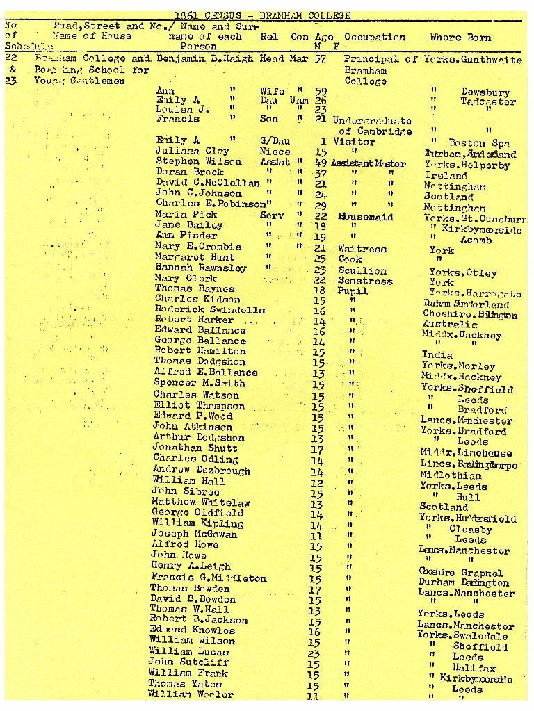 8. & 9. The 1961 census of Bramham College together and the 1841 census of the Bramham Boarding School for Young Ladies.
