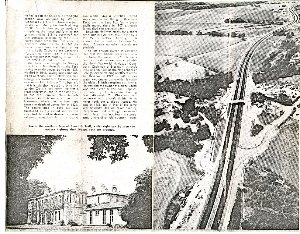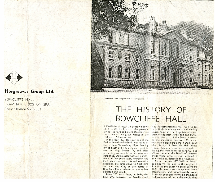 1. & 2. Reprint of an article from Hargreaves Group magazine on the subject 'The History of Bowcliffe Hall' including a photo of the Hall and an aerial view showing its location.