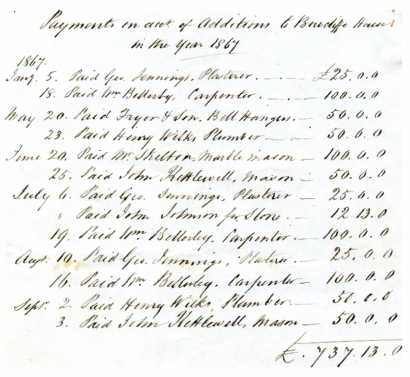 3. A list of 'Payments in Acct. of Additions to Bowcliffe House in 1867' totalling £737 13s 0d.