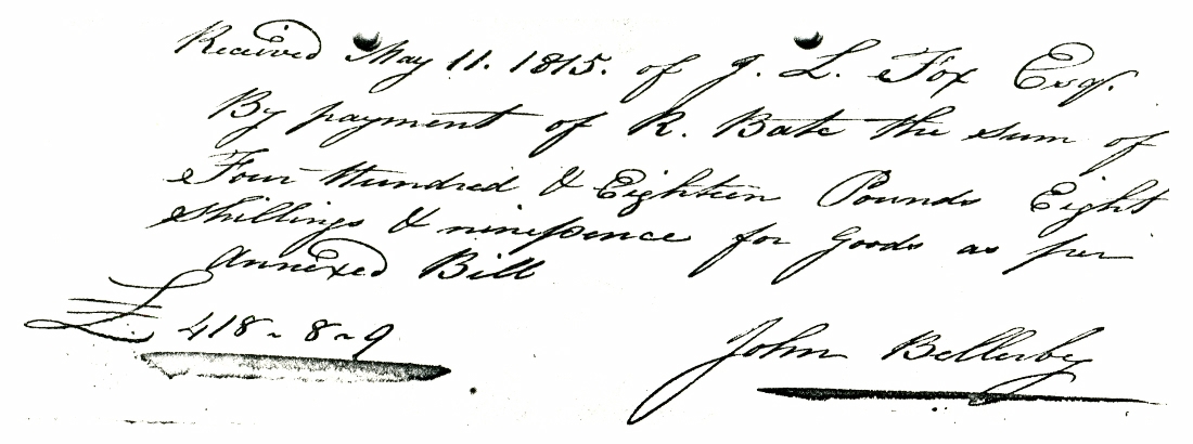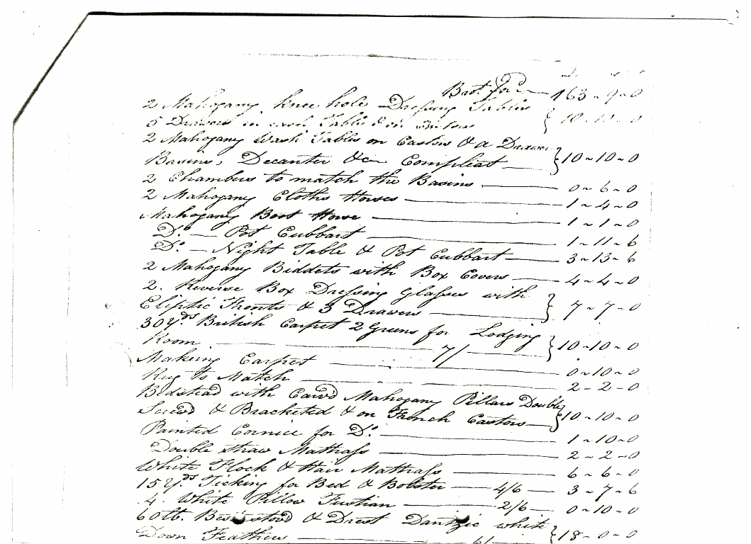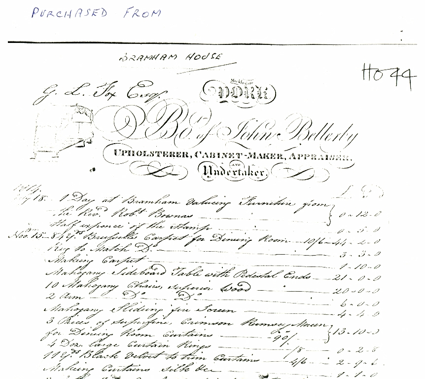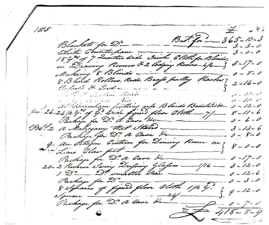 1. - 6. A receipt for £418 8s 9d dated May 11, 1815 for a five page list of individually priced items of furniture and soft furnishings supplied by John Bellerby, Upholsterer, Cabinet-maker, Appraiser and Undertaker during 1814 and 1815.