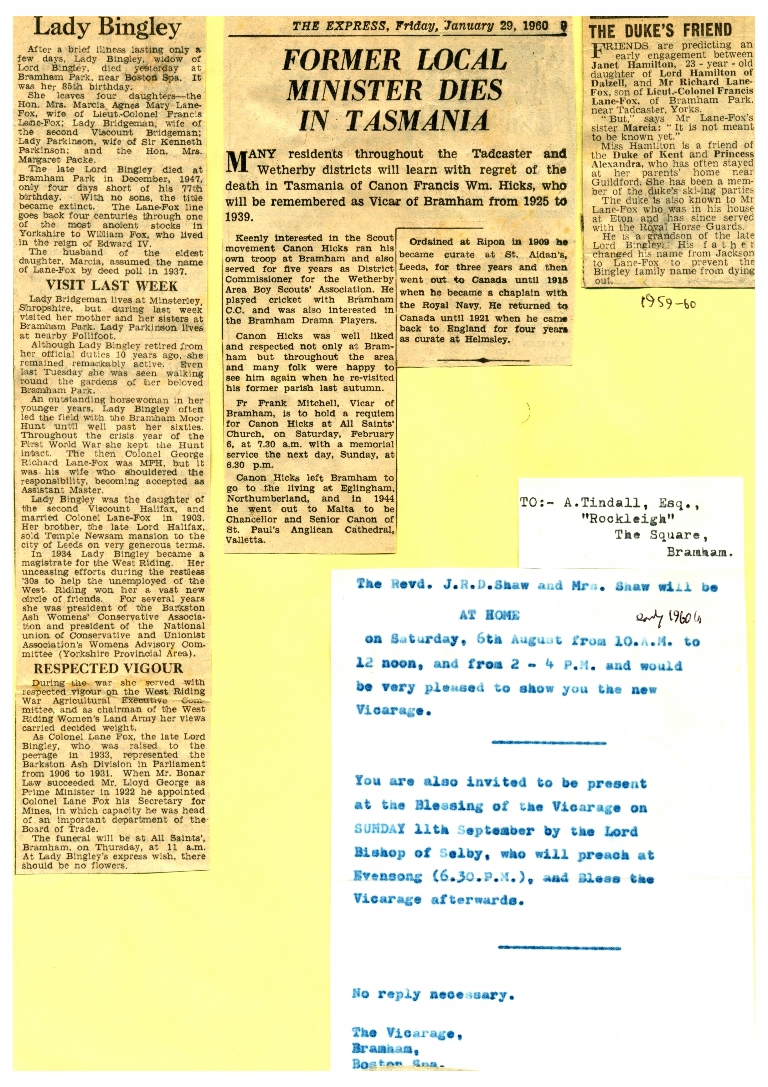 1. Newspaper article reporting the death of Lady Bingley, widow of Lord Bingley, at Bramham Park aged 85.