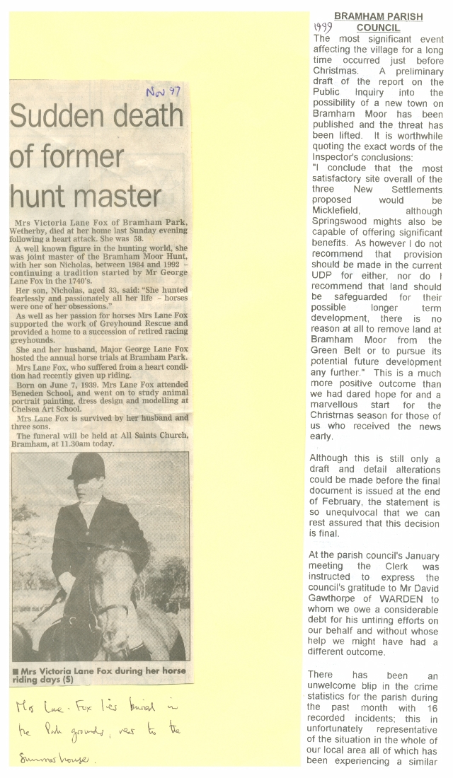 1. A press report on the death of Mrs. Lane Fox in November 1997 at the age of 58 as a result of a heart attack. She was well known in the hunting world having been joint master with her son Nicholas of the Bramham Moor Hunt from 1984 to 1992. Some details of her early life are given.